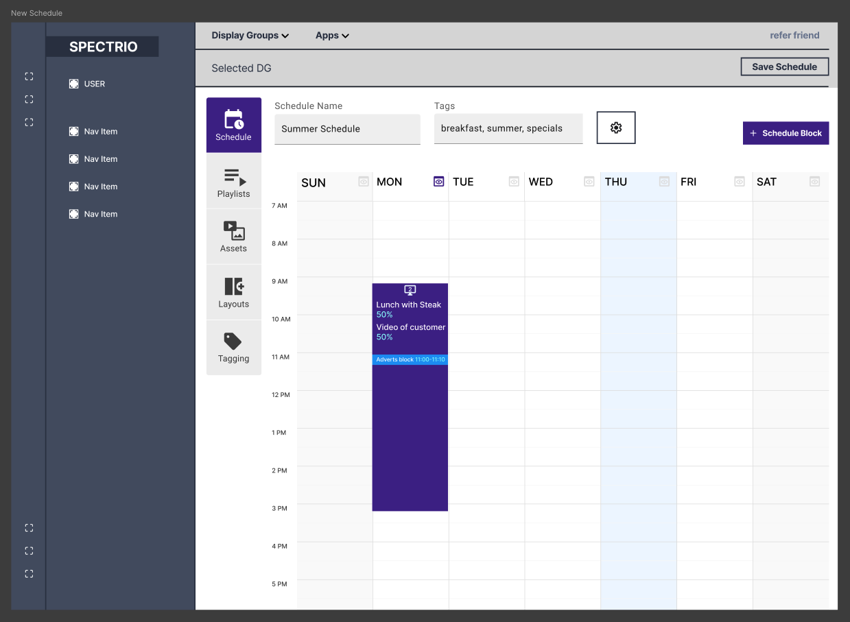 Designing intuitive scheduling solutions means understanding that users want ease and flexibility without micromanaging every moment. I created a system that simplifies setup while allowing for nuanced exceptions between days and weeks. The design prioritizes flexibility and versatility, enabling users to seamlessly mix their own content with third-party advertising while maintaining control over what’s displayed and when.